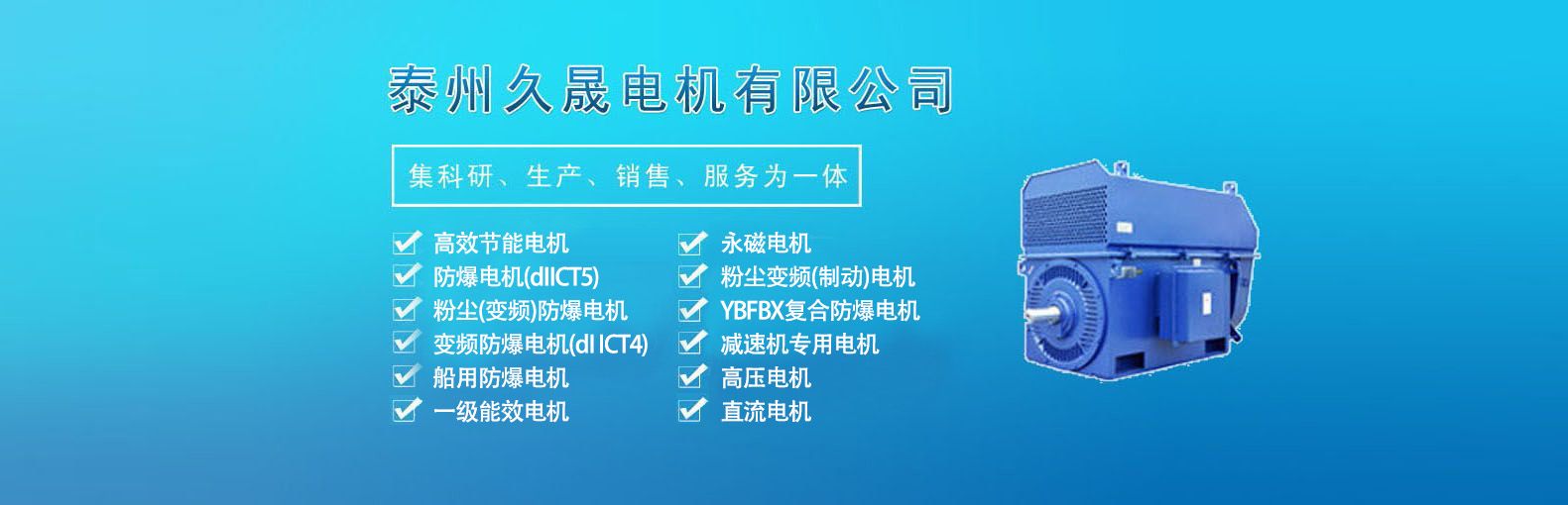 泰州久晟電機(jī)有限公司是一家集科研、生產(chǎn)、銷(xiāo)售、服務(wù)為一體的現(xiàn)代化企業(yè)